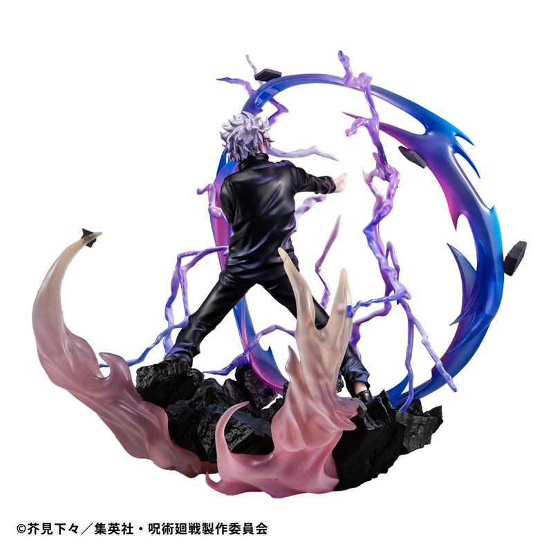『呪術廻戦』より、五条悟が大ボリュームで再登場します。作中のイメージそのままに、虚式「紫」を放つ姿をエフェクト造形も盛り込み大迫力に立体化しました。