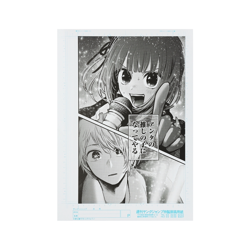 ※本商品は、横槍メンゴ先生の『【推しの子】』デジタル原稿(YJC収録2023年6月30日時点最新版)を、空の専用原稿用紙スキャンデータ内に配置し、B4サイズで出力したものになります。掲載誌やコミックス では見ることができなかった断ち切り線の外側の書き込みを確認することができます。