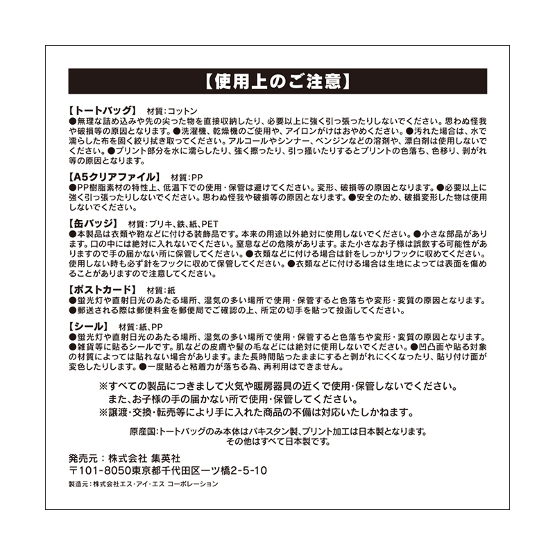 ミニトート1つ、A5クリアファイル3枚、ステッカー1枚、ポストカード4枚、缶バッジ3個がまとめて手に入る超お得なセット!最強を誇る「日本防衛隊」の魅力がたっぷり堪能できる!!