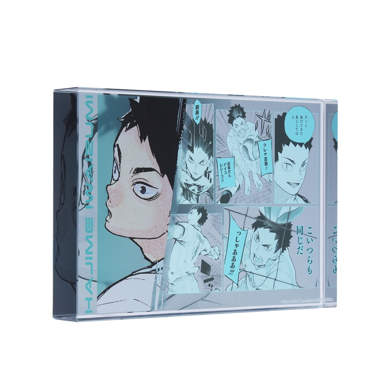 『ハイキュー!!』岩泉一のアクリルブロック!厚さ20mmのアクリルは存在感MAX!!岩泉一のかっこいいカラーカットの背面には、名シーンのコマが散りばめられているぞ。インテリアにぴったり!