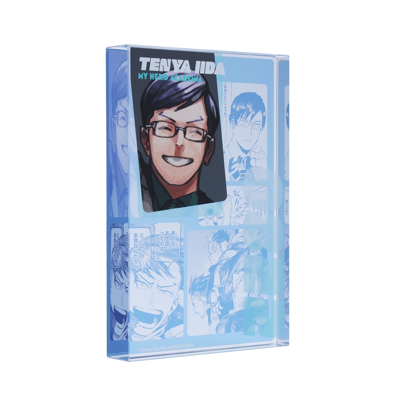 『僕のヒーローアカデミア』飯田天哉のアクリルブロック!厚さ20mmのアクリルは存在感MAX!!飯田天哉のかっこいいカラーカットの背面には、名シーンのコマが散りばめられているぞ。インテリアにぴったり!