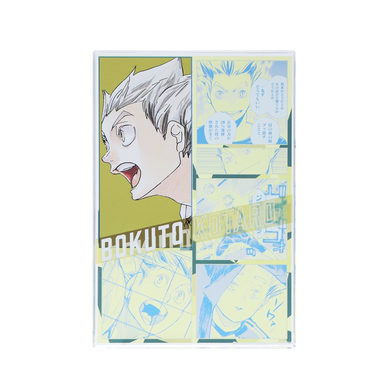 『ハイキュー!!』木兎光太郎のアクリルブロック!厚さ20mmのアクリルは存在感MAX!!木兎光太郎のかっこいいカラーカットの背面には、名シーンのコマが散りばめられているぞ。インテリアにぴったり!