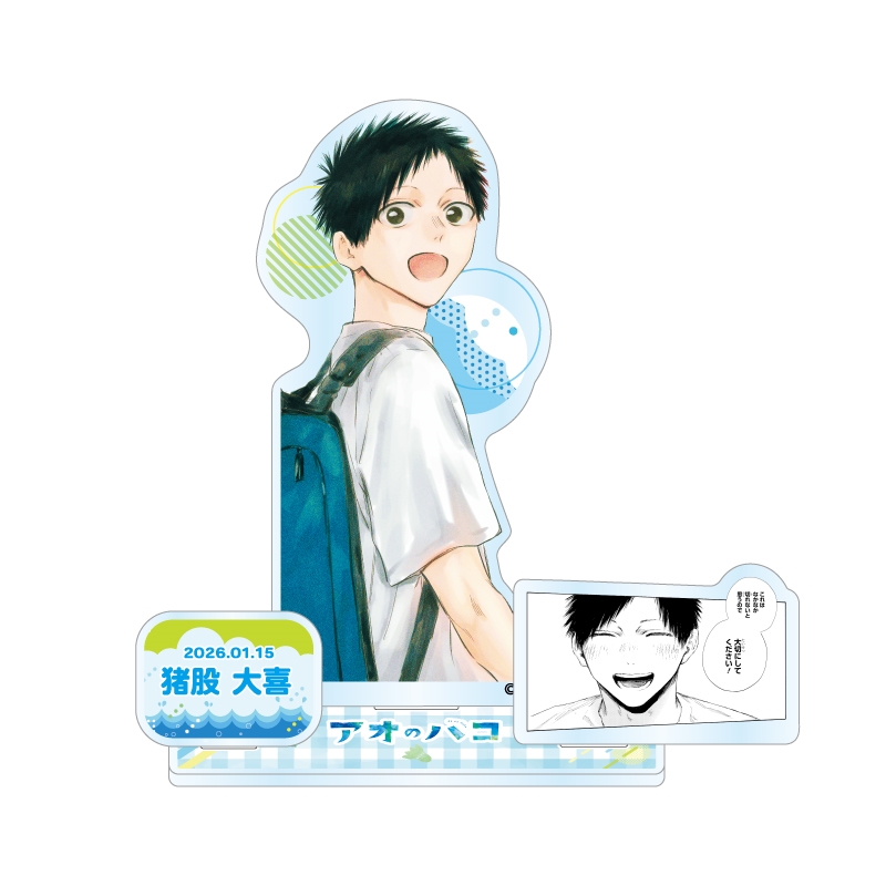 『アオのハコ』猪股大喜のカラーイラスト+作中の名場面のコマイラスト+名前&誕生日パーツが立体的に組みあがった、アクリルジオラマフィギュア!